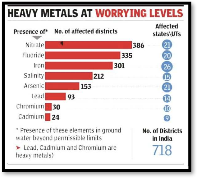 •As per the reply of Central Government in Parliament in 2018, the groundwater is contaminated with the excess nitrate in 386 districts, fluoride in 335 districts, lead in 93 districts, chromium in 30 districts and cadmium in 24 districts, iron in 301 districts, salinity in 212, arsenic in 153 districts of different states across India.