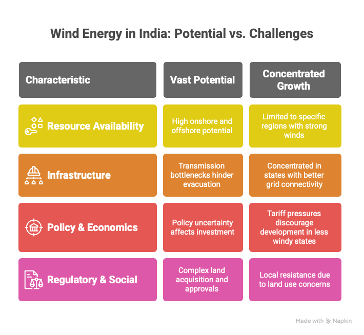 Despite the vast potential, wind energy’s spatial distribution in India is far from uniform. Several intertwined factors explain this pattern: